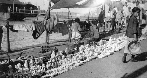 1922 年的江边露天市场,距今快有一百年了。地上放着许多陶瓷雕塑,一旁的小姑娘拎着盆回头看向了镜头。